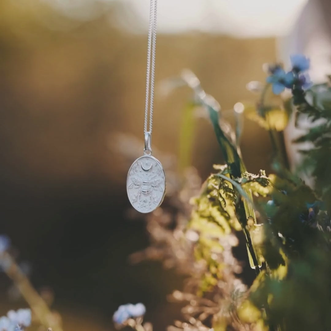Mit ihrem besonderen Design ist unsere Kette Biene & Mond ein perfekter Begleiter für alle, die die Natur lieben. Die ersten Bienen im Jahr zeigen sich bereits zum Frühlingsbeginn. So richtig fleißig werden die zarten Insekten aber erst, wenn der Sommer vor der Tür steht und viele wundervolle Wildblumen blühen. Umrahmt wird die Biene von zarten Blüten-Ranken. Über ihr befindet sich eine mystische Mondsichel.