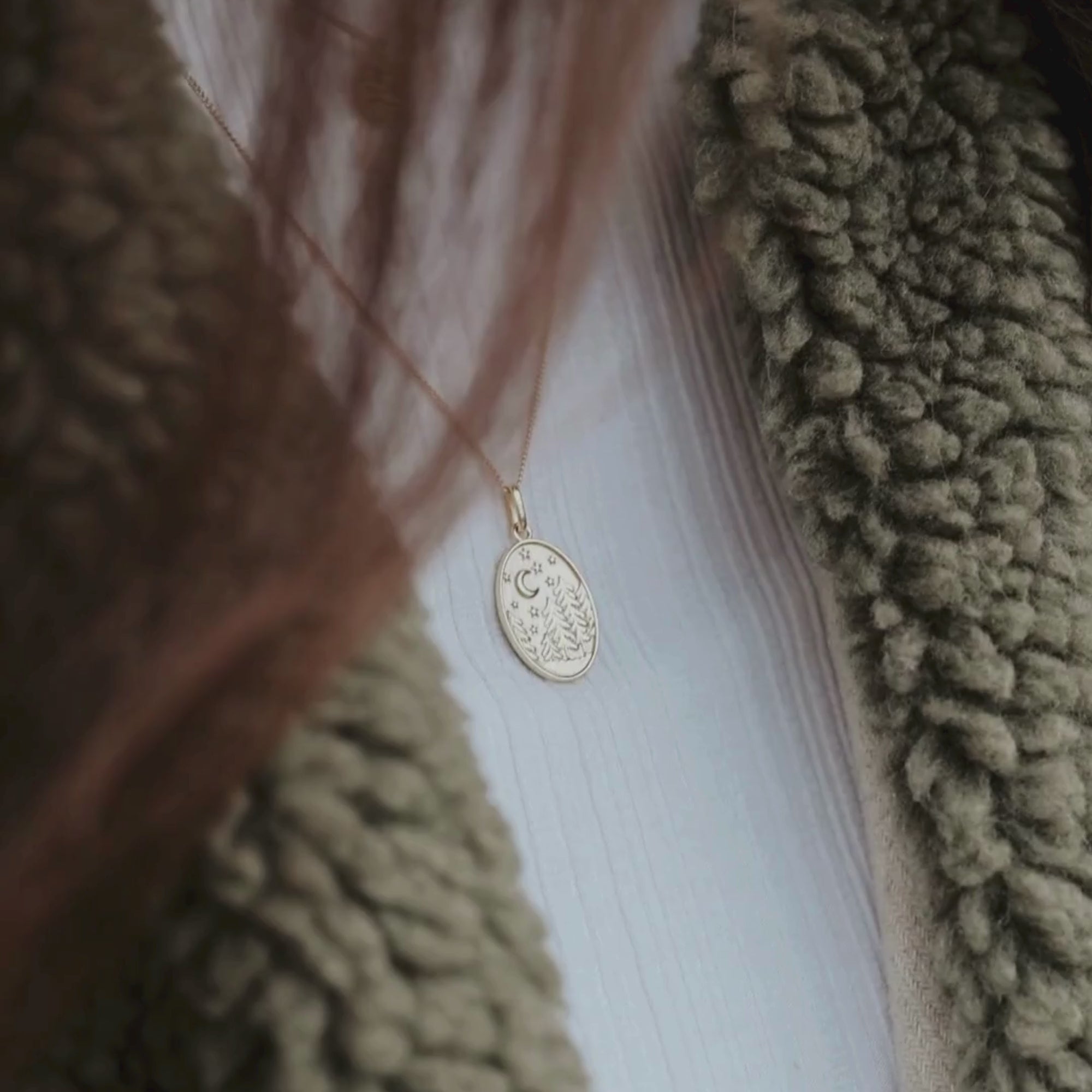 Die Kette Nachtwald erinnert uns an magische Mitternachts-Spaziergänge, bei denen uns der Wald außergewöhnlich, einzigartig und geheimnisvoll vorkommt. Die dunklen Bäume bringen das helle Leuchten von Mond und Sternen besonders zum Vorschein. Diese außergewöhnlichen, friedvollen Momente in der Natur fängt der Anhänger gekonnt ein. Die Kette Nachtwald ist auch das perfekte Geschenk für jemanden, mit dem Du diese Augenblicke teilen möchtest.