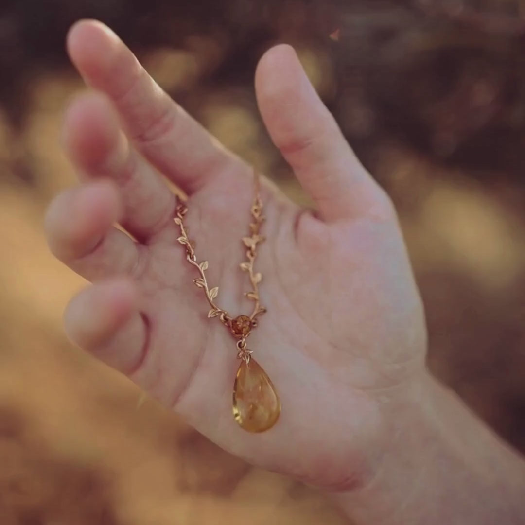 Wenn Du auf der Suche nach einem ganz besonderen Schmuckstück bist, könnte unsere Kette Gintara die perfekte Wahl für Dich sein. Im oberen Bereich wirkt die Kette relativ schlicht, doch jede weiter es Richtung Anhänger geht, wird sie immer einzigartiger. Stiele einer Pflanze mit Blättern halten einen runden Bernstein, der wiederrum den großen ovalen Bernstein-Anhänger trägt. Sowohl der warme Goldton der Kette als auch der leuchtende Bernstein-Anhänger erinnern uns an goldene Herbstwälder.