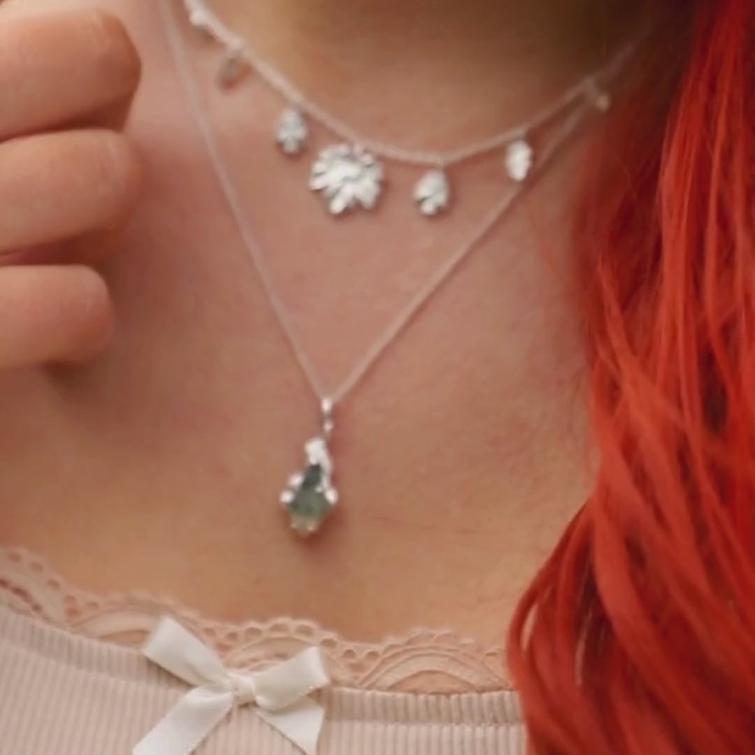 Wusstest du, dass 'Achat' aus dem Griechischen stammt und 'glücklich' bedeutet? Der besonders schöne Moosachat, welcher auch als 'Stein der Gärten' bezeichnet wird, ist in unserer Kette Moosachat kunstvoll von Blätterranken gehalten. In Kombination mit dem kühlen silbernen Ketten sticht er besonders hervor.