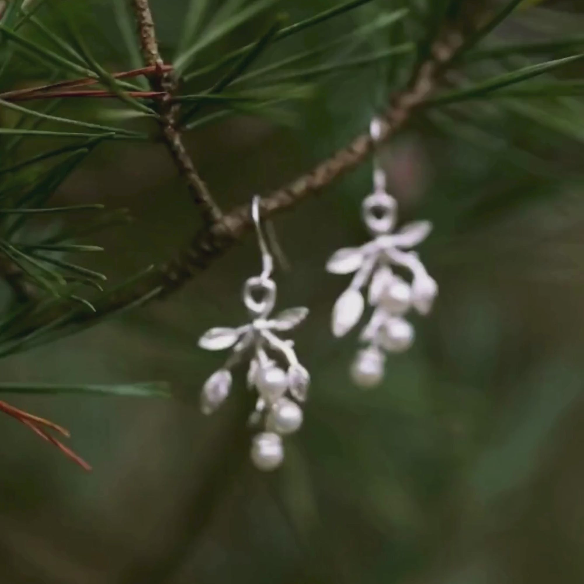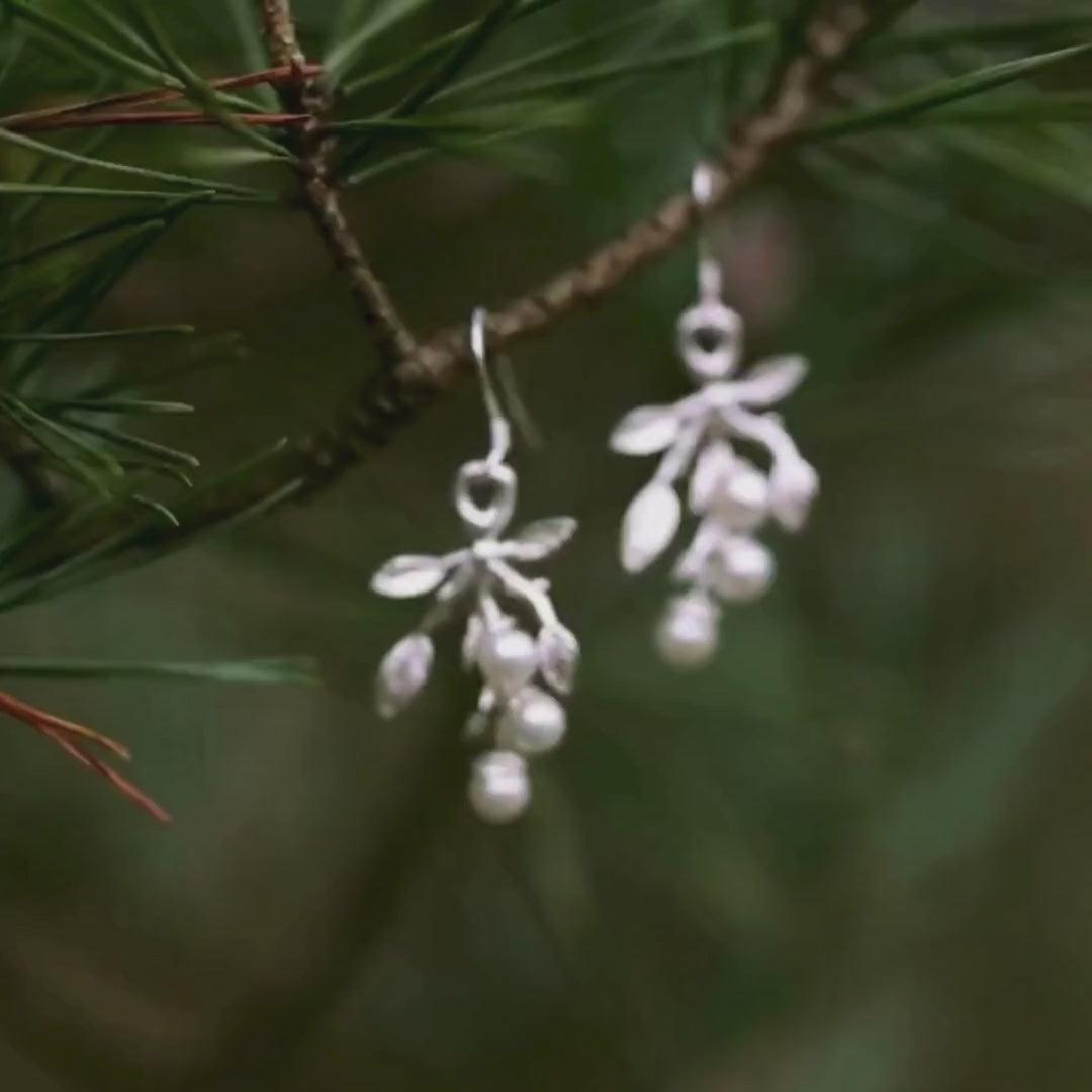 Die Ohrringe Schneebeere sind von der gleichnamigen Pflanze inspiriert. Die beiden Zweige mit ihren Blättern sind an schlichten Ohrringen befestigt und in einem kühlen Silber gestaltet. Jeweils drei Schneebeeren, aus echten Perlen, hängen an einem Zweig und glänzen wie Kugeln am Weihnachtsbaum. Das Zusammenspiel beider Farbtöne macht diese winterlichen Ohrringe zu etwas ganz Besonderem.