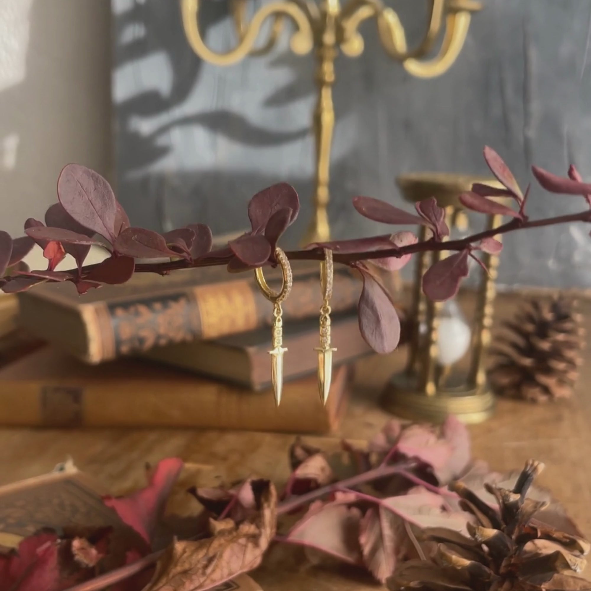 Du suchst etwas Besonderes für deine Date-Night, ein expressives Schmuckstück im Dark Academia Stil? Dann sind diese Creolen, was du brauchst. Sie schmücken zwei kaiserzeitliche römische Schwerter und geben deinem Look damit einen gewissen Königinnen-Flair. Sie sind mit je 13 wunderschön gefassten Zirkonia-Steinen verziert und aus vergoldetem 925 Sterling Silber gefertigt. Stürz dich mit Coletta in die Nacht und genieße sie königlich!