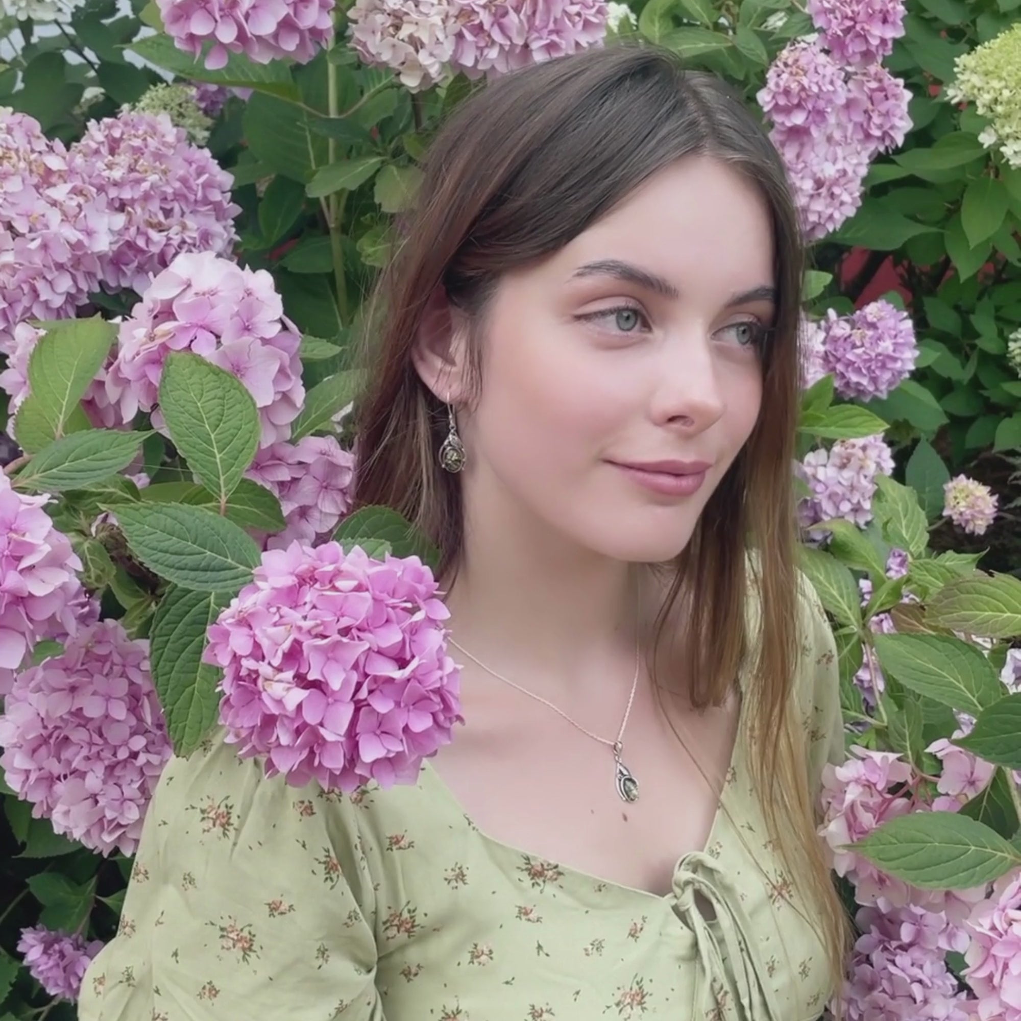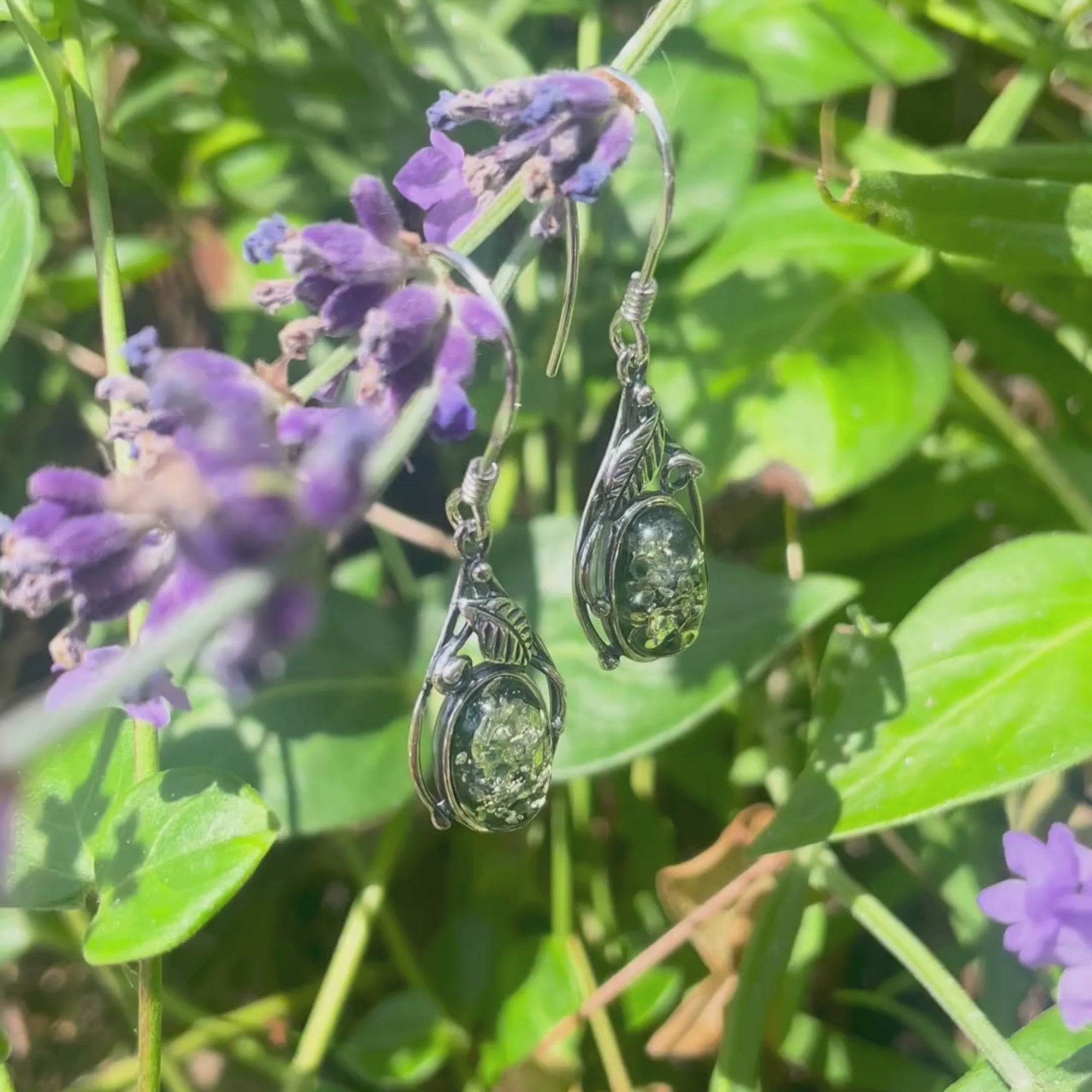 Die Ohrringe Elvina haben ein bezauberndes Aussehen und erinnern an den Schmuck einer Elfe. Grüner Bernstein wurde dafür in einem Rahmen aus silbernen Blättern gefasst. Mit der passenden Kette Elvina machst du dein elfengleiches Auftreten perfekt.