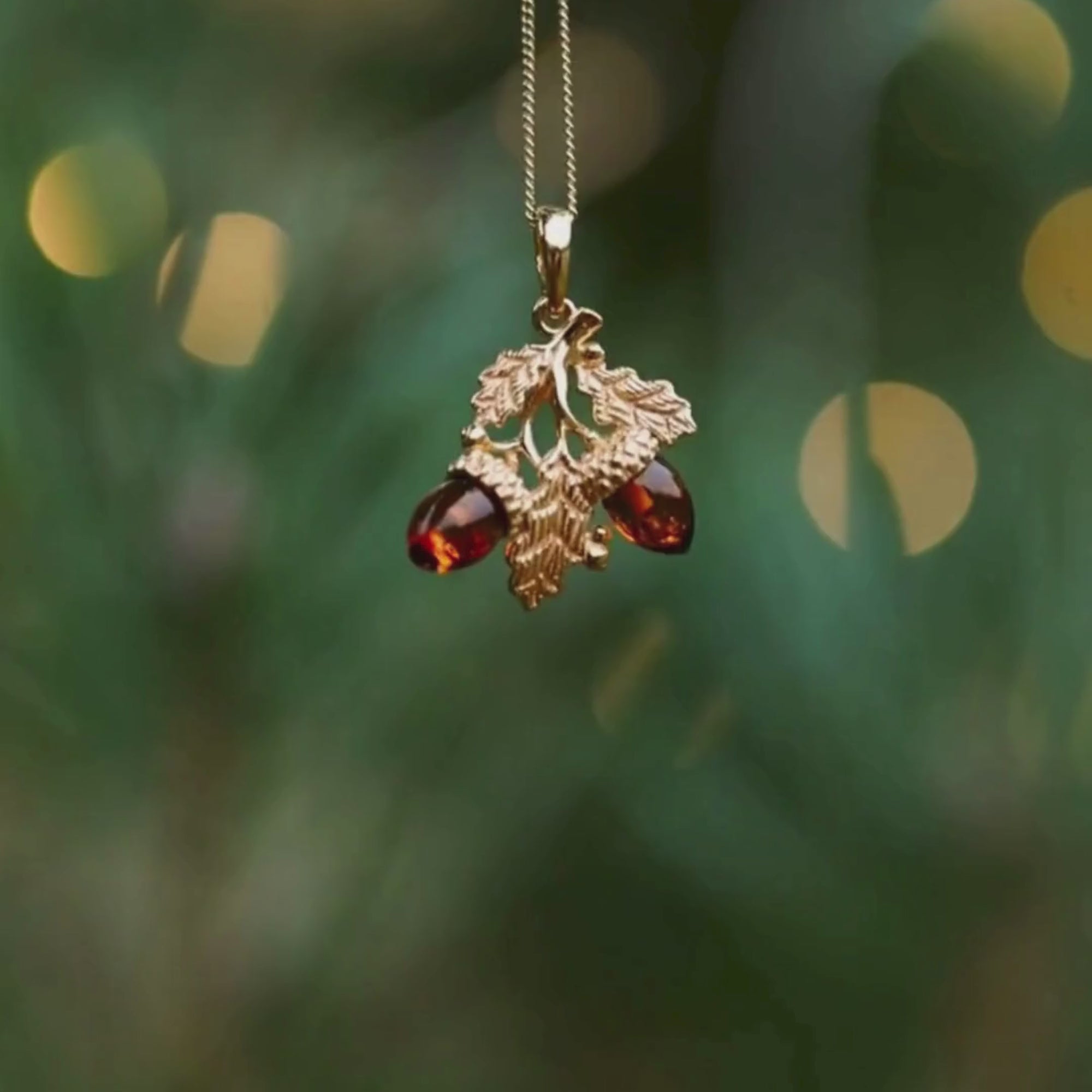 A necklace that reflects the magic of Christmas with its warm, vibrant colors—that's our Amber Acorn and Leaf Necklace. A branch with oak leaves and two acorns hang from a delicate chain. The acorns are crafted from natural brown amber, creating a perfect contrast to the golden leaves. Amber is considered a symbol of optimism and joie de vivre—making our Amber Acorn and Leaf Necklace the perfect companion for the upcoming Christmas season.