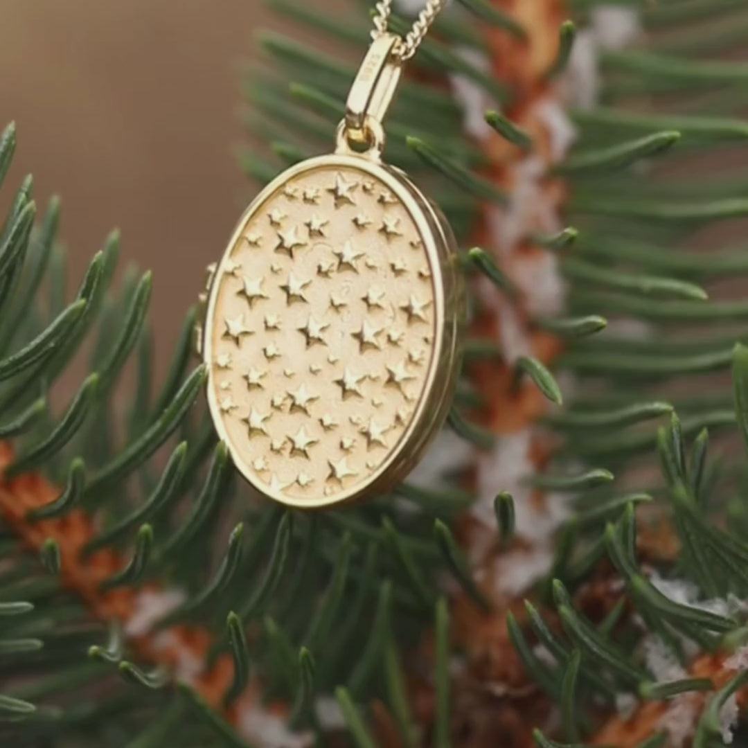 Der ovale Anhänger unseres Medaillons Mond & Sternenhimmel wird von einer filigranen vergoldeten Kette gehalten und lässt sich öffnen. So kannst du eine besondere Botschaft im Inneren verschenken oder nah an deinem Herzen tragen. Eine perfekte Mondsichel, umringt von vielen kleinen Sternen, versprüht dabei ein Hauch von Magie und macht diese Kette zu etwas ganz Besonderem.