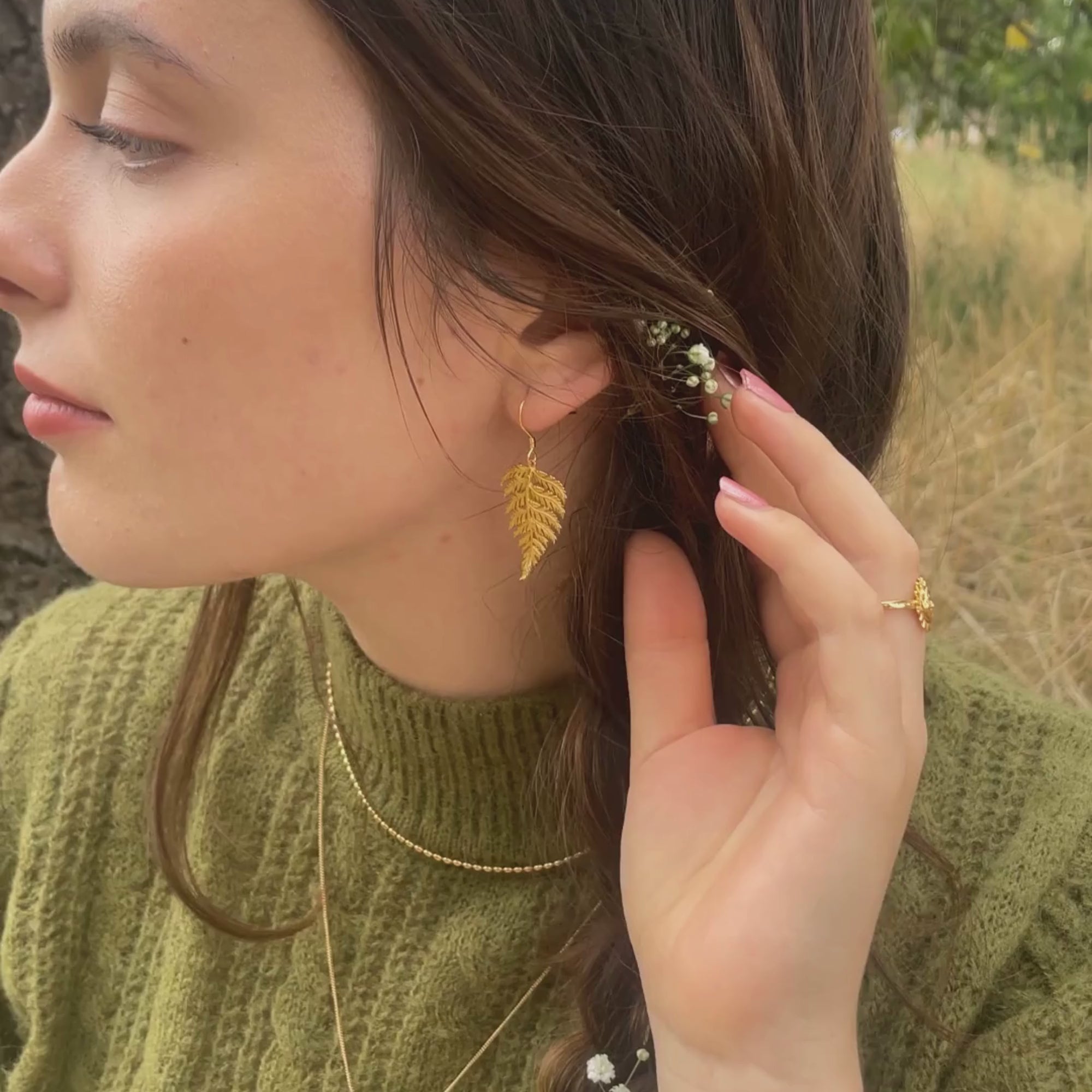 Der Mythologien zufolge gilt der Farn als Pflanze der Götter. Eine wunderschöne Pflanze, die als mindestens genauso geheimnisvoll wie magisch ist – so auch unsere besonderen Ohrringe Farn. An Deinen Ohren kommt der liebevoll und naturgetreu gestaltete Schmuck ganz besonders gut zur Geltung, wenn Du sie mit schlichten Ohrsteckern kombinierst oder mit unserer passenden Farn-Schmuck.